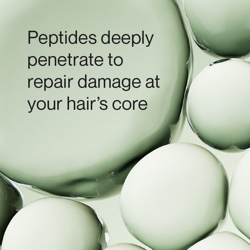 Our formula’s components feature a well-balanced range of molecular weights to repair hair at each layer. Key peptides are able to penetrate the hair’s surface and deliver their benefits inside the hair’s cortex due to their lower molecular weights – smaller molecules are able to go straight to the core. Other ingredients adhere to damaged areas in the middle layers and at the cuticle surface for thorough repair at every level.